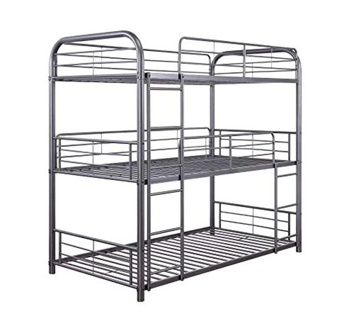 Description Brand: Acme Furniture Color: Gunmetal Features: Built-In 2 Front Ladders Easy Access Guard-Rail Slat System Included (20+20+20) Metal Tube: Powder Coating Details: The ultimate space saver for small rooms, the Cairo triple metal bunk bed will be the best additional for your sweet home. Stacking three beds securely, the…