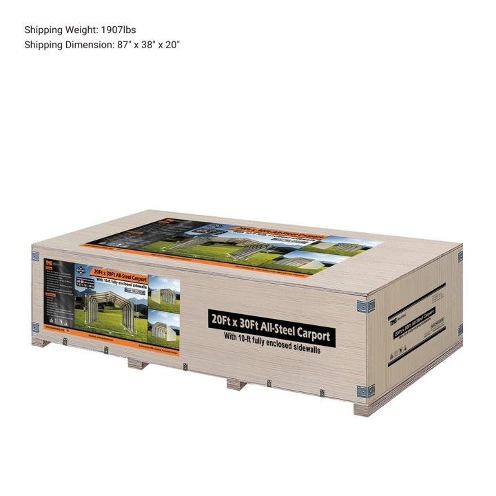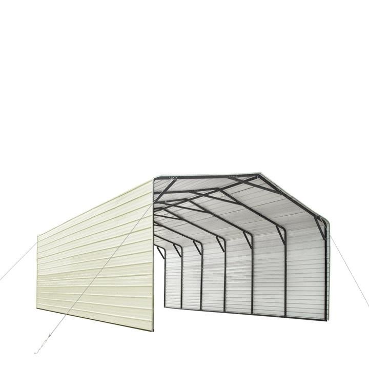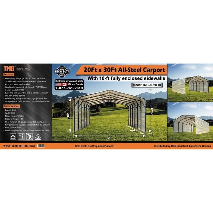 The TMG Industrial 20* x 30* All-Steel Carport Shed with an increased sidewall height of?10′?is designed to last through years of sun, wind, rain, and snow. The roof is made of 27-gauge corrugated steel that is fully galvanized and coated with cream-coloured polyester paint. A 15-gauge 2 powder-coated steel tube frame and anchor cables make this car shelter tough enough to handle 75MPH winds and a snow load of 30 PSF. The frame is easy to assembly with slip-fit connections and self-drilling screws.